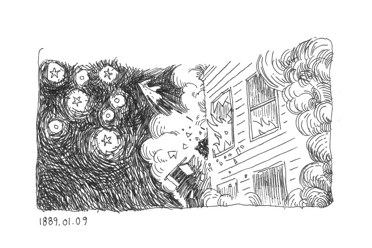 Wednesday January 9th 1889: The creature created from flame at Weaver’s Laundry on First Street rushes upstairs in attempt of escape, ejecting furniture off the second story before dissipating in the midnight air.