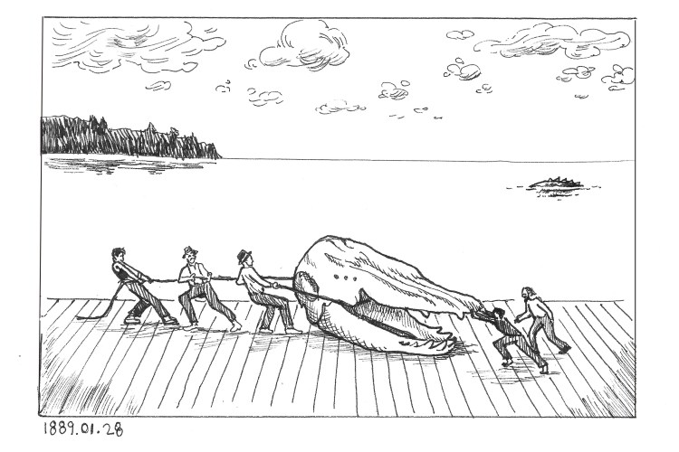 Monday January 28th 1889: A team of men haul a large skull up to Kingston’s wharf as a threat to the beast beneath the waters of Humboldt Bay.