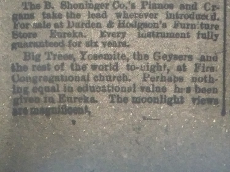“Big Trees, Yosemite, the Geysers and the rest of the world to-night, at First Congregational church. Perhaps nothing equal in educational value has been given in Eureka. The moonlight views are magnificent.”