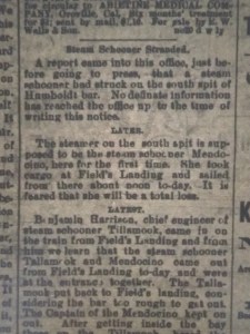 The steamer on the south spit is supposed to be the steam schooner Mendocino, here for the first time. She took cargo at Field’s Landing and sailed from there about noon to-day. It is feared that she will be a total loss.