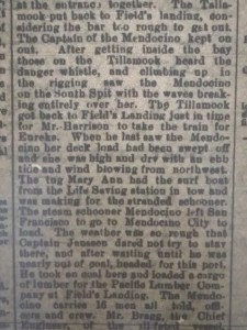 Benjamin Harrison chief engineer of steam schooner Tillamook, came in on the train from Field’s Landing and from him we learn that the steam schooner Tallamook and Mendocino came out from Field’s Landing to-day and were at the entrance together. The Tallamook put back to Field’s landing, considering the bar too rough to get out. The Captain of the Mendocino kept on out.
