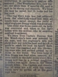 We learn from Captain Hansen that the Mendocino’s boat was manned by six men, and the engineer’s wife and child were put into the boat and an effort made to reach the land on the South Spit. The boat was capsized and the life-saving crew who had arrived picked up all those in the water. The little baby of Mrs. Bragg was dead when rescued. All were taken to the light house where Mrs. Bragg lies in a critical condition. A Doctor was taken down in the steam launch Alice. The Captain and remainder of crew are still with the vessel, which may be gotten off at the next high tide.”
