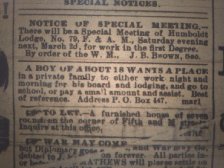 As found in the March 1st 1889 Humboldt Daily Standard.