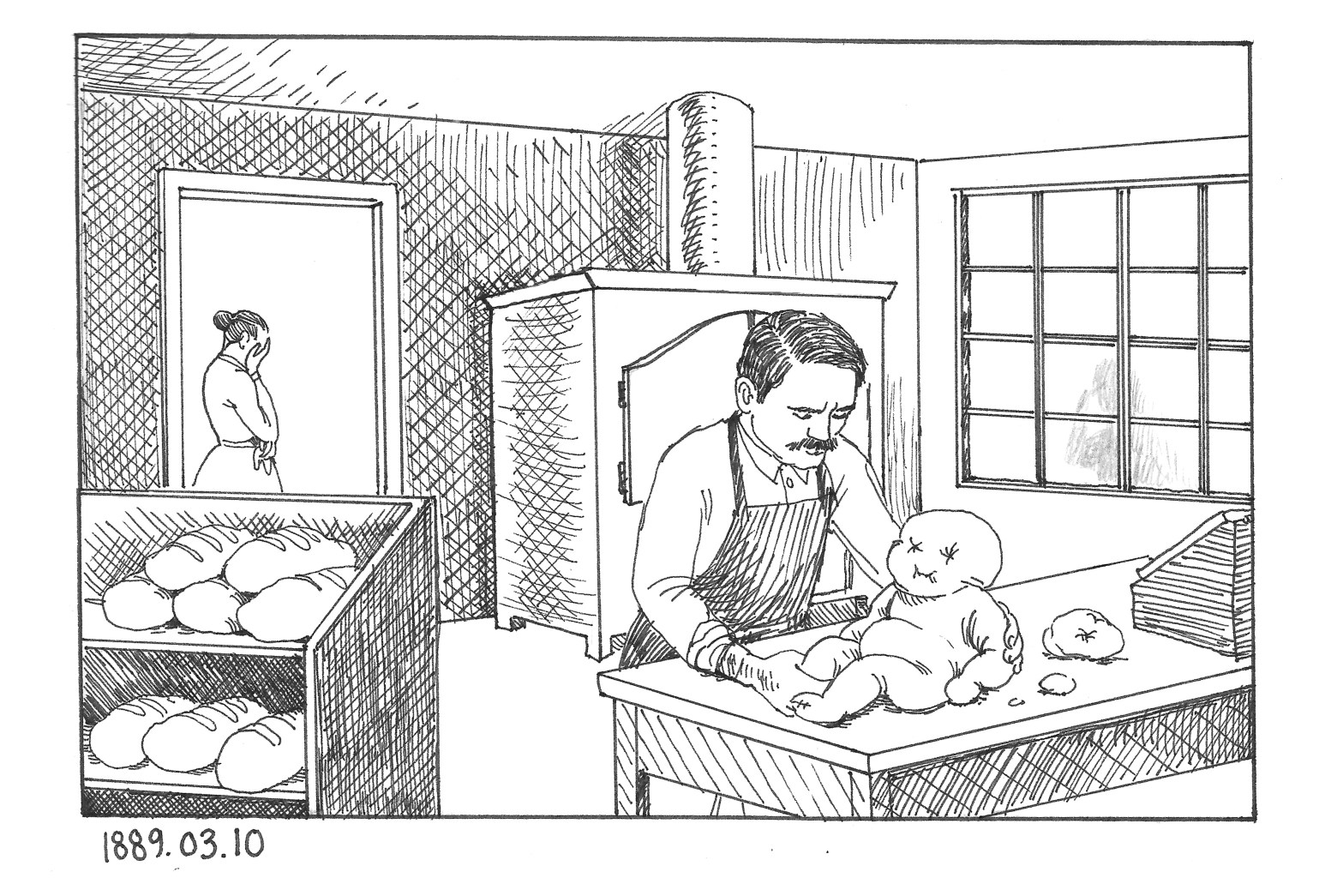 Sunday March 10th 1889: To ease his wife’s grief following the recent loss, the baker shapes a baby from dough which slowly grows faster than a boy of flesh and blood. Read more here. See more here.