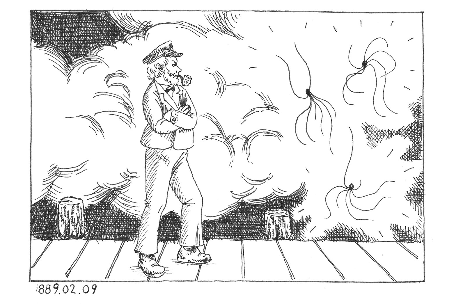 Saturday February 9th 1889: Creating just enough mist to ground the steamer, the faeries offer a bargain for future fair passages. The Captain contemplates. Read more here and here. See more here.
